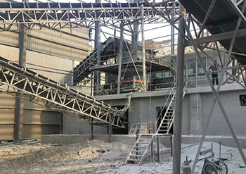 花崗巖原料由顎破破碎后經(jīng)中轉(zhuǎn)料倉(cāng)進(jìn)入單缸液壓圓錐破HST100,將10-20mm直接篩走作為成品石子,0-10mm,20-30mm經(jīng)皮帶機(jī)進(jìn)入中專(zhuān)料倉(cāng)進(jìn)高效制砂機(jī)VSI5X9532,出料再返回振動(dòng)篩篩分,然后成品進(jìn)洗砂機(jī)水洗后經(jīng)皮帶機(jī)輸送至成品料堆。