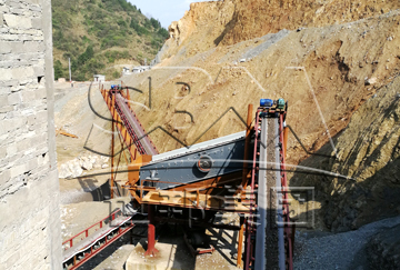 開山爆破的石灰石,經(jīng)過F5X1360給料機(jī)預(yù)篩分,50mm以下小料及渣土進(jìn)入除土篩,小料直接輸送到鄂破的出料皮帶上,大料經(jīng)過顎破破碎后和小料一起進(jìn)入中轉(zhuǎn)料倉,而后由皮帶輸送機(jī)進(jìn)入一臺CI5X1520新型液壓反擊破破碎,出來的石料經(jīng)過兩臺S5X2460-2新型振動(dòng)篩篩分,大料返到一臺PF1315反擊破破碎,20-31.5mm成品碎石篩出,其余0-20mm碎石進(jìn)入兩臺S5X2460-3進(jìn)行篩分,篩分出0-5-10-20三種成品。