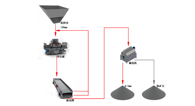日運(yùn)轉(zhuǎn):10小時(shí) 進(jìn) 料:粒度25mm以下鐵礦石干拋料 成 品:0-5mm砂