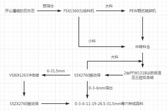 主機設(shè)備:PEW顎式破碎機、2臺PFW反擊破碎機、VSI6X制砂機