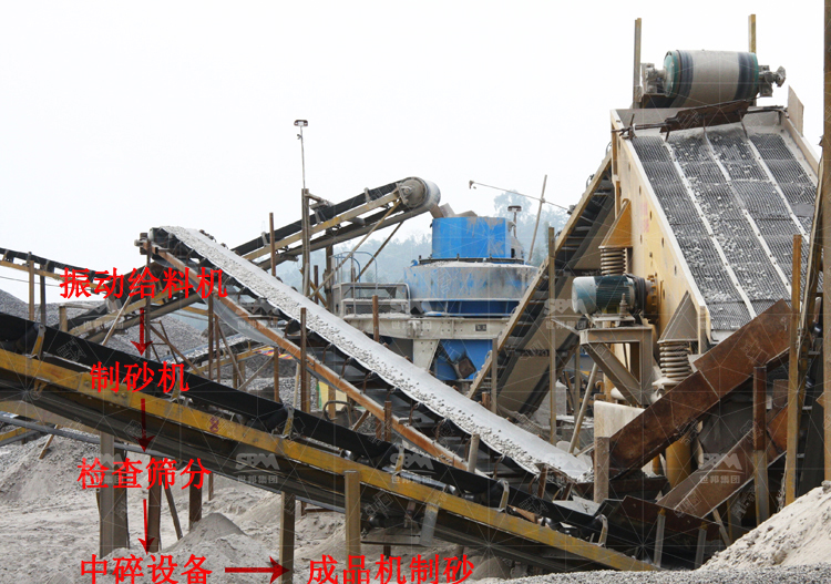 制砂:經由破碎后的石灰石石子,一部分作為成品直接送往料堆,另一部分由制砂機進行粉碎、制砂作業(yè);