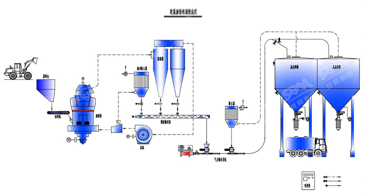 石灰石(或者塊頭生石灰)物料經(jīng)粉碎到所需粒度后,由提升機(jī)將物料送至儲(chǔ)料斗,再經(jīng)振動(dòng)給料機(jī)將料均勻連續(xù)的送入雷蒙磨主機(jī)磨室內(nèi),由于旋轉(zhuǎn)時(shí)離心力作用,在磨機(jī)主機(jī)底部的鏟刀將物料石灰石(或者塊頭生石灰)向上托起,讓石灰石(或者塊頭生石灰)緊壓于磨環(huán)與磨輥之間,物料送到磨輥與磨環(huán)之間,因磨輥的滾動(dòng)碾壓而達(dá)到將石灰石粉碎目的,在石灰石細(xì)碎料進(jìn)入主機(jī)時(shí)由熱風(fēng)送入雷蒙磨主機(jī)頂部的一級(jí)收塵風(fēng)選機(jī),得到200目石灰粉,其他較粗的石灰細(xì)碎料跌入磨機(jī)底座,再由鏟刀托起進(jìn)行碾磨。合格的細(xì)粉由熱風(fēng)送入主機(jī)頂部的一級(jí)風(fēng)選機(jī),325目的升到二級(jí)風(fēng)選機(jī),通過風(fēng)選機(jī)進(jìn)入脈沖收塵器,再進(jìn)入包裝機(jī)進(jìn)行包裝。
