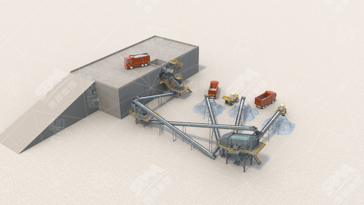 石灰石大塊物料經(jīng)料倉由振動給料機(jī)均勻喂料,輸送到顎式破碎機(jī)進(jìn)行粗碎,粗碎后的物料經(jīng)振動篩篩分后,由皮帶輸送機(jī)輸送至反擊式破碎機(jī)。