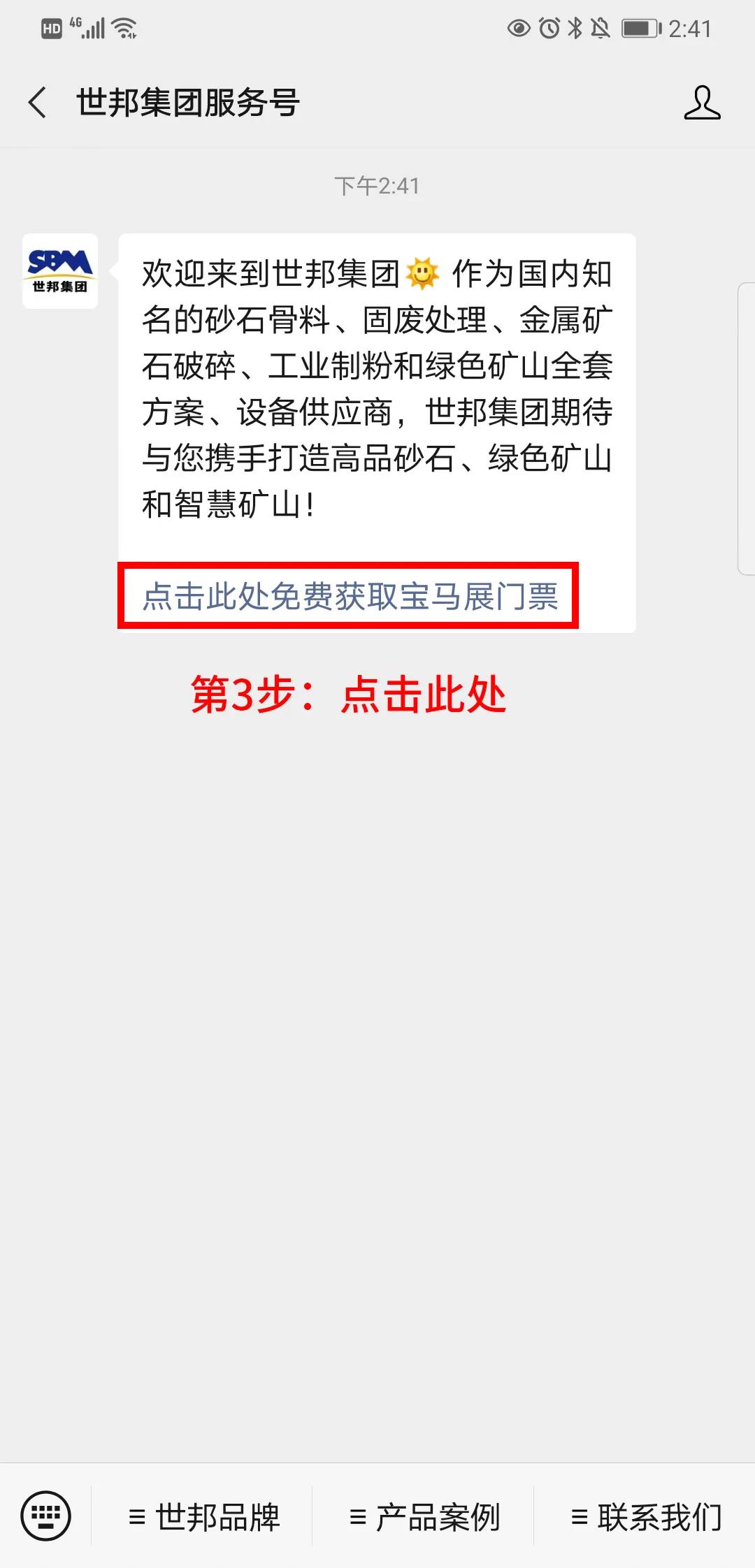 備注:如您已關(guān)注世邦集團服務(wù)號,可在聊天框直接輸入關(guān)鍵詞【寶馬展門票】,登記后,同樣可以免費獲取價值50元寶馬展門票~快去試試吧~