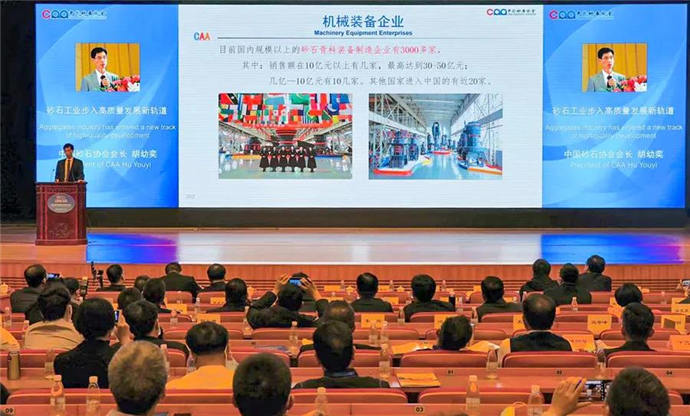 在主旨演講環(huán)節(jié),中國砂石協(xié)會胡幼奕會長做了《砂石工業(yè)步入高質(zhì)量發(fā)展新軌道》的主旨報告。胡會長不僅從國家和地方政府發(fā)布的政策、未來經(jīng)濟發(fā)展趨勢、砂石骨料的市場需求等層面深度解析了目前砂石行業(yè)的發(fā)展狀況,更從行業(yè)角度深度剖析了砂石行業(yè)的未來發(fā)展方向和發(fā)展模式,指出高品質(zhì)機制砂將是未來基建用砂石主要供應(yīng)源,所以砂石企業(yè)要充分利用礦石產(chǎn)業(yè)得天獨厚的條件,要敢于思變,通過理念、科技、模式等全方位的顛覆創(chuàng)新,為砂石產(chǎn)業(yè)綠色發(fā)展和高質(zhì)量發(fā)展提供堅實支撐,在保護好環(huán)境的同時讓礦山產(chǎn)業(yè)高質(zhì)量發(fā)展。
