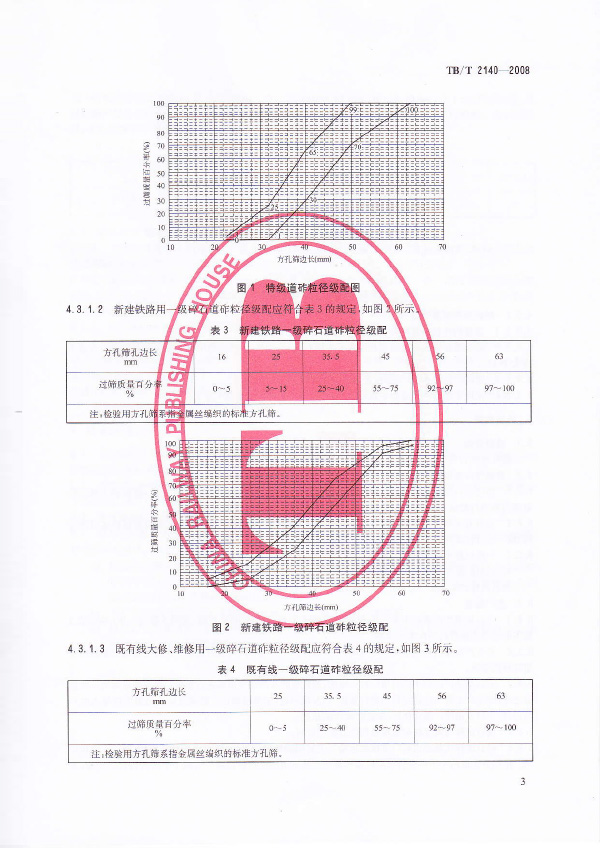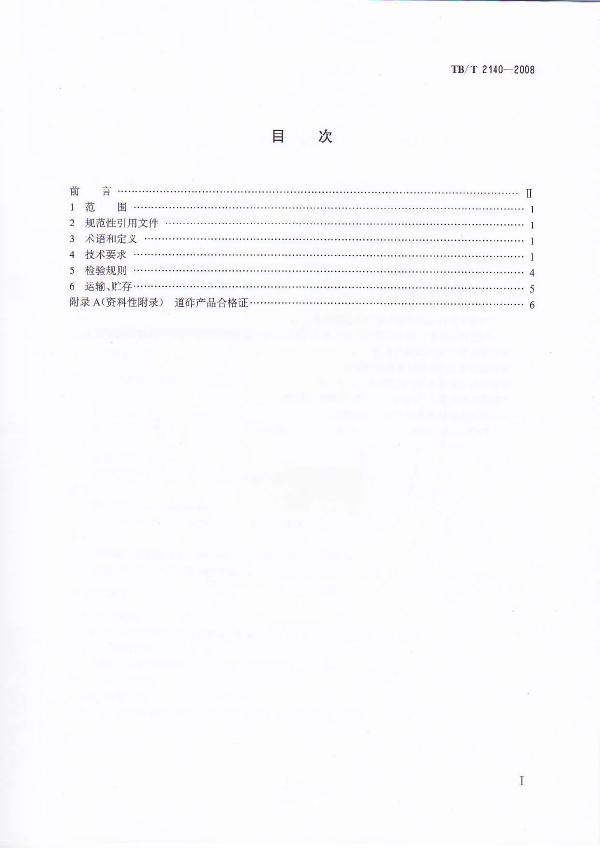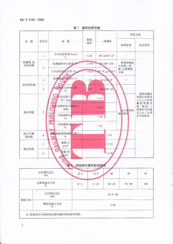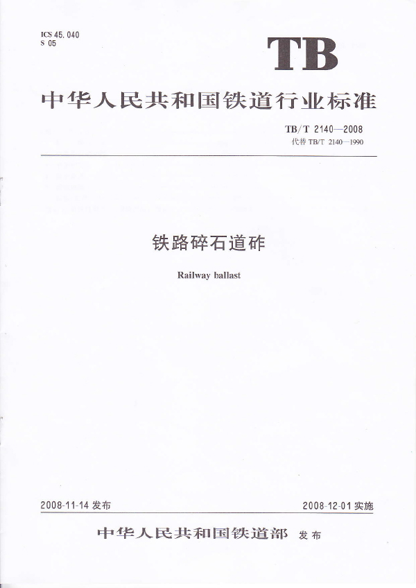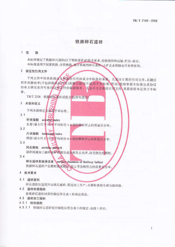 本標(biāo)準(zhǔn)規(guī)定了鐵路碎石道砟的技術(shù)要求、檢驗(yàn)規(guī)則和運(yùn)輸、貯存、驗(yàn)交。明確對(duì)道砟粒徑、級(jí)配、顆粒形狀及清潔度的檢驗(yàn)指標(biāo);對(duì)道砟集料壓碎率指標(biāo)值做出規(guī)范;對(duì)道砟運(yùn)輸貯存提出了更為嚴(yán)格的要求,保證出場(chǎng)上道道砟的級(jí)配符合本標(biāo)準(zhǔn)的相關(guān)要求。